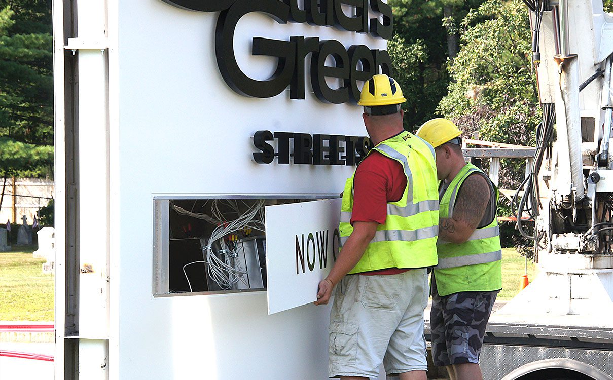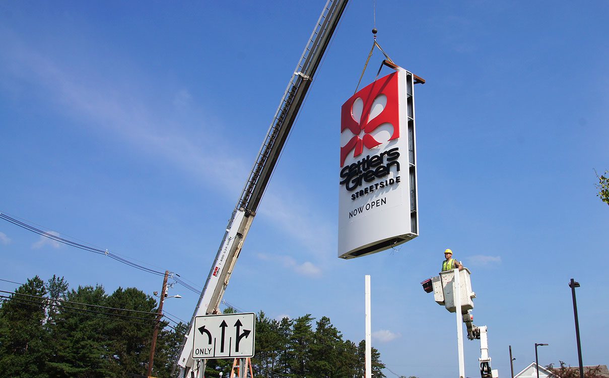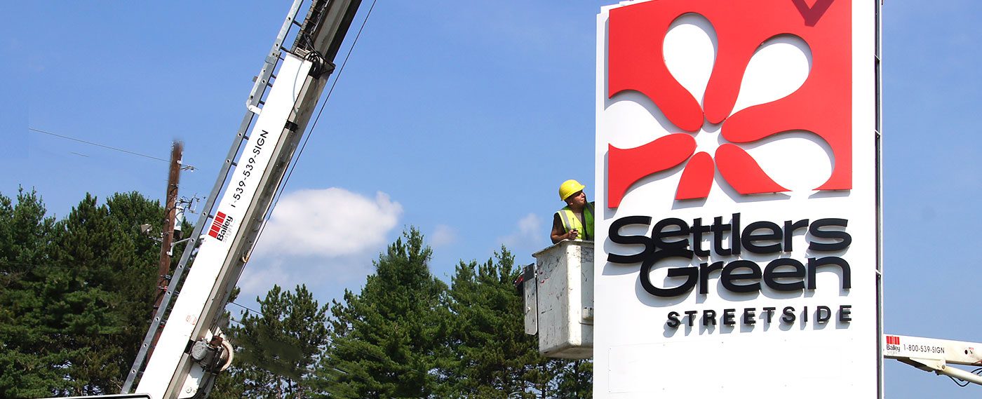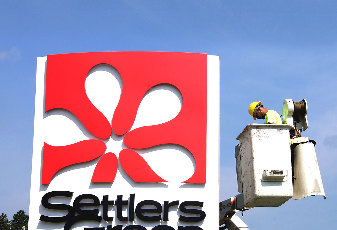 Materials and fabrication details were selected to perform in a high exposure setting, with an emphasis on durability and long term performance. Together, the pylon and supporting signage system create a clear and organized experience, helping visitors navigate the site efficiently while reinforcing the presence of Settlers Green within the regional retail landscape.