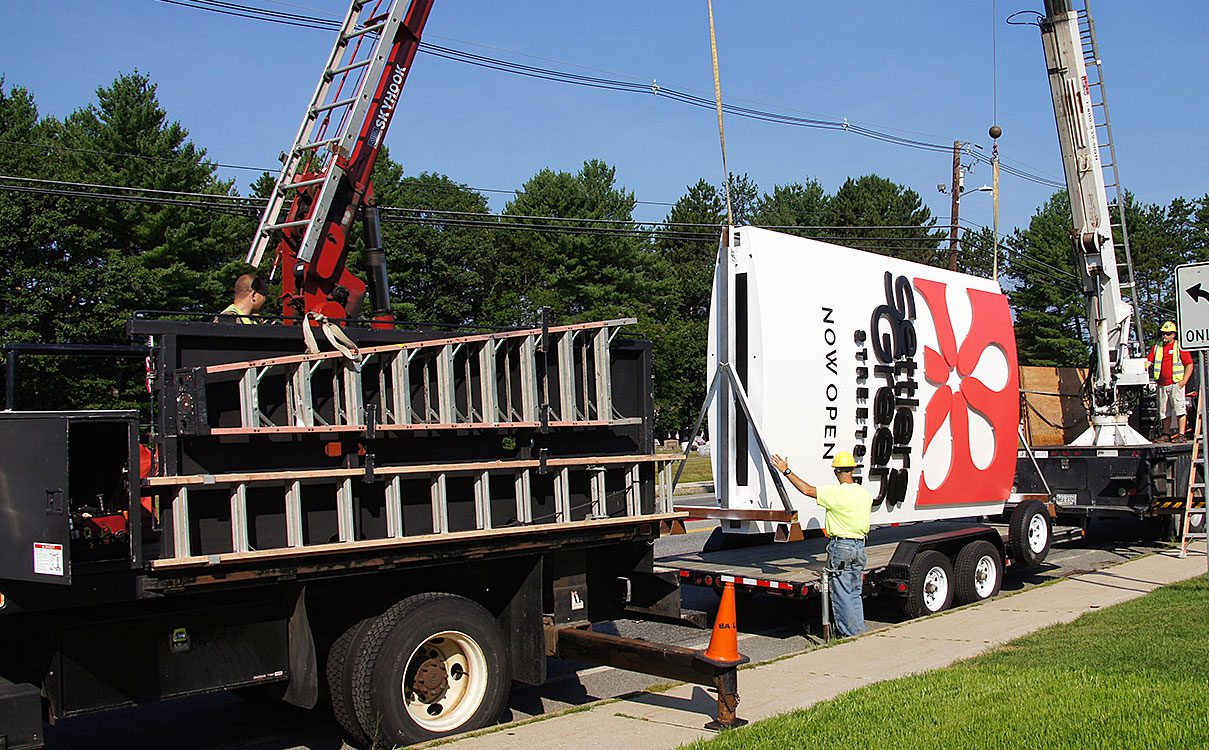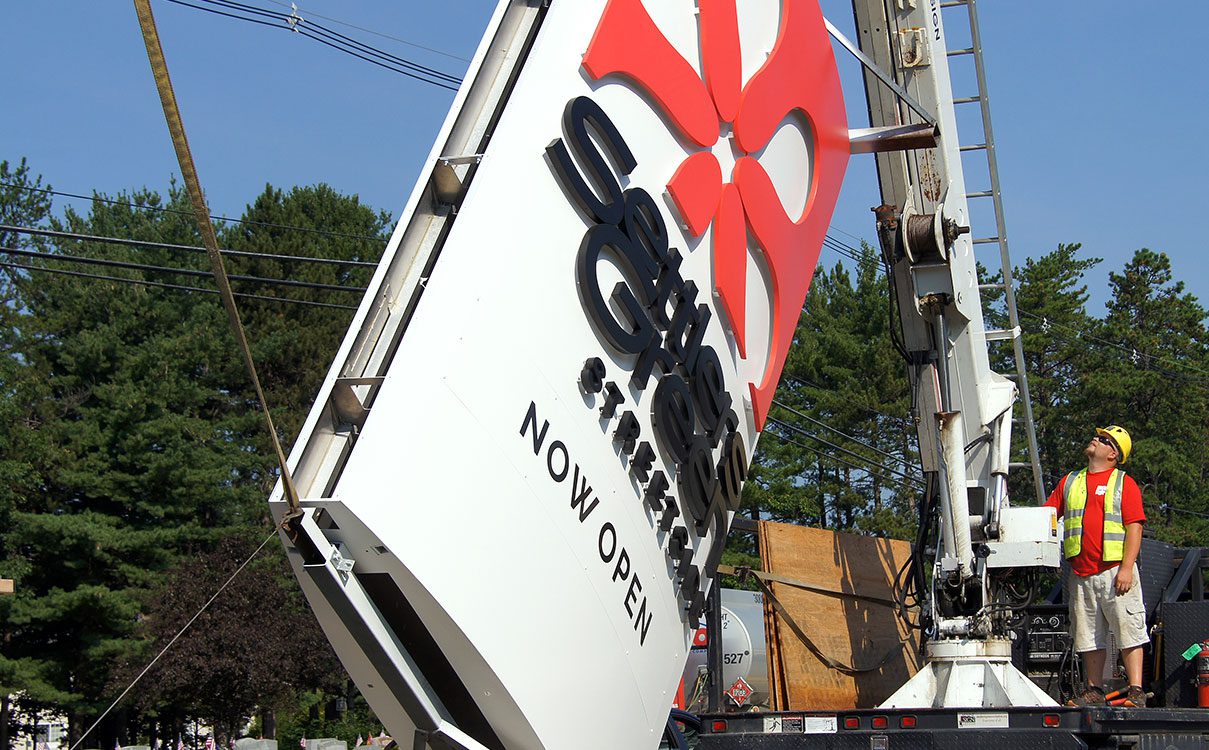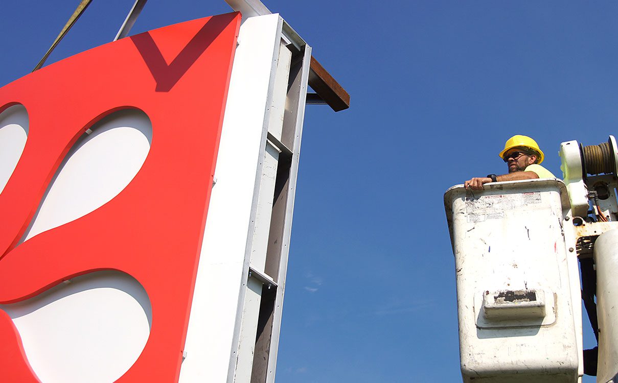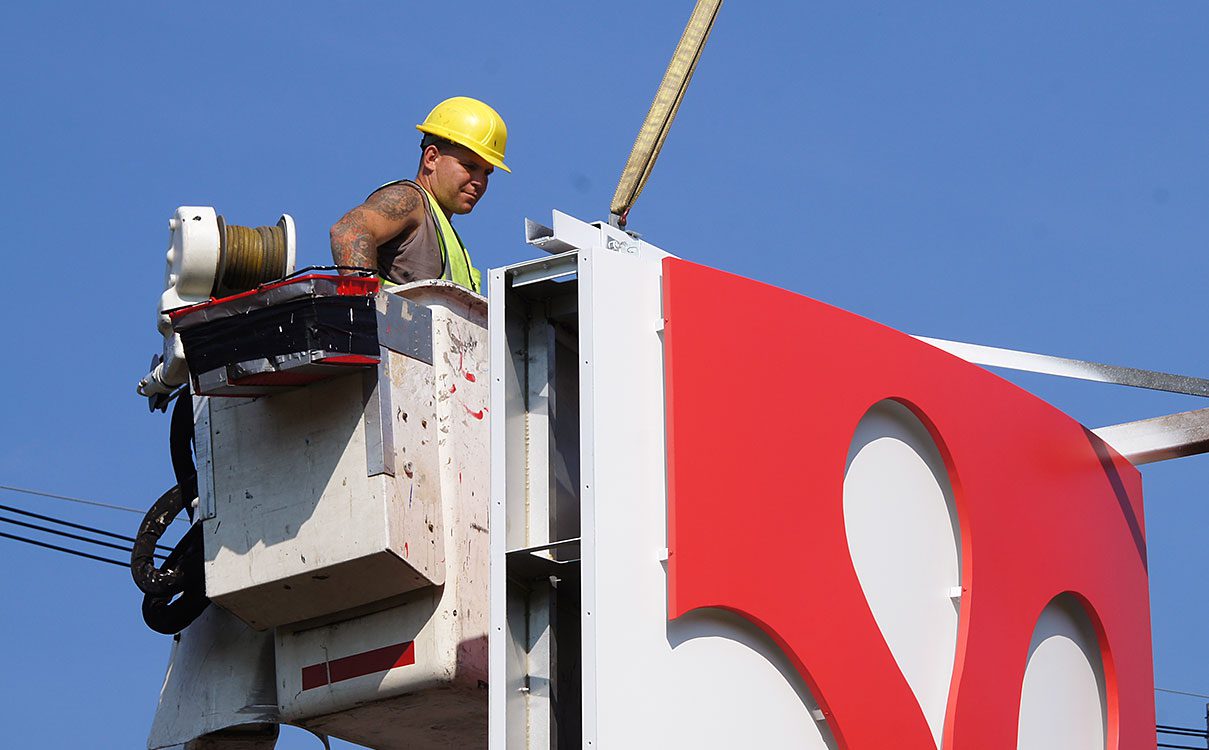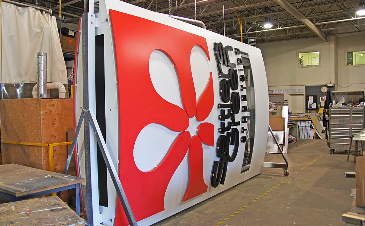At the center of the signage program is a large internally illuminated pylon sign engineered for long range visibility and continuous operation. The structure was designed to accommodate integrated illumination, internal access, and serviceability while maintaining clean proportions and a refined exterior profile. Light output and distribution were carefully calibrated to ensure consistent nighttime legibility without excessive brightness, allowing the sign to perform effectively within its roadway and environmental context.
