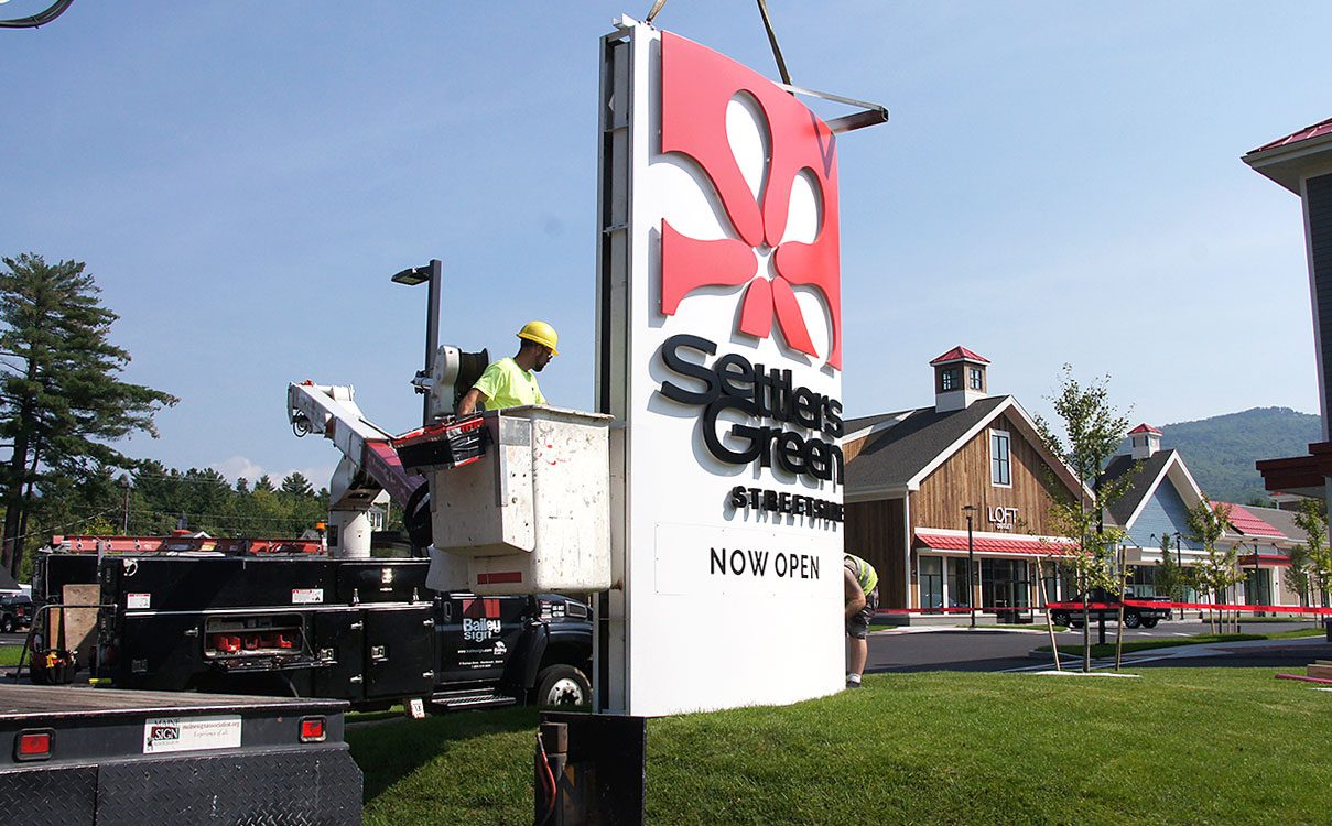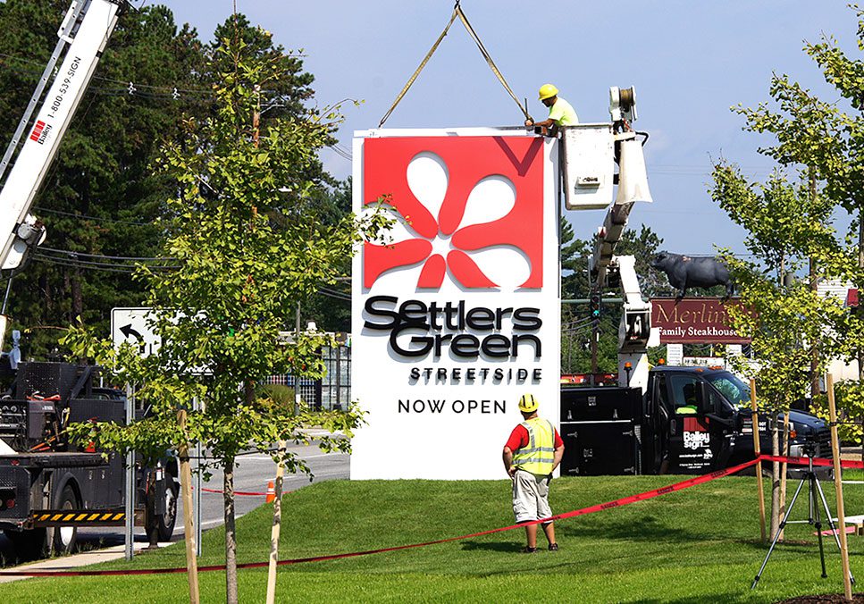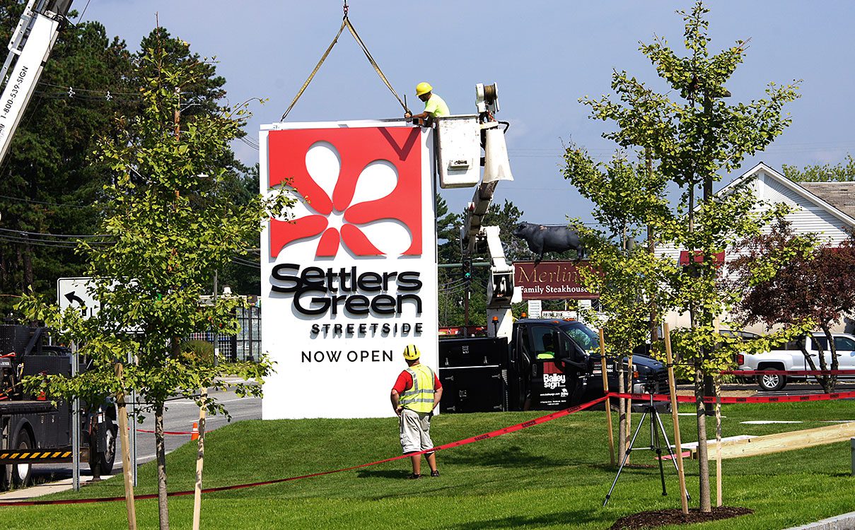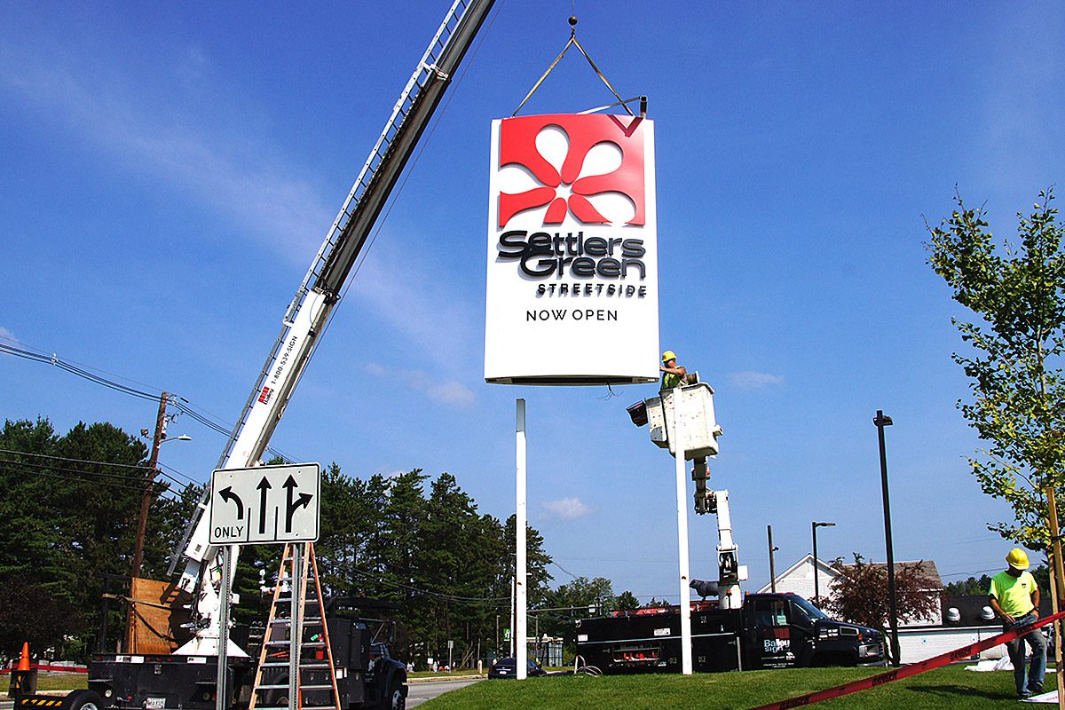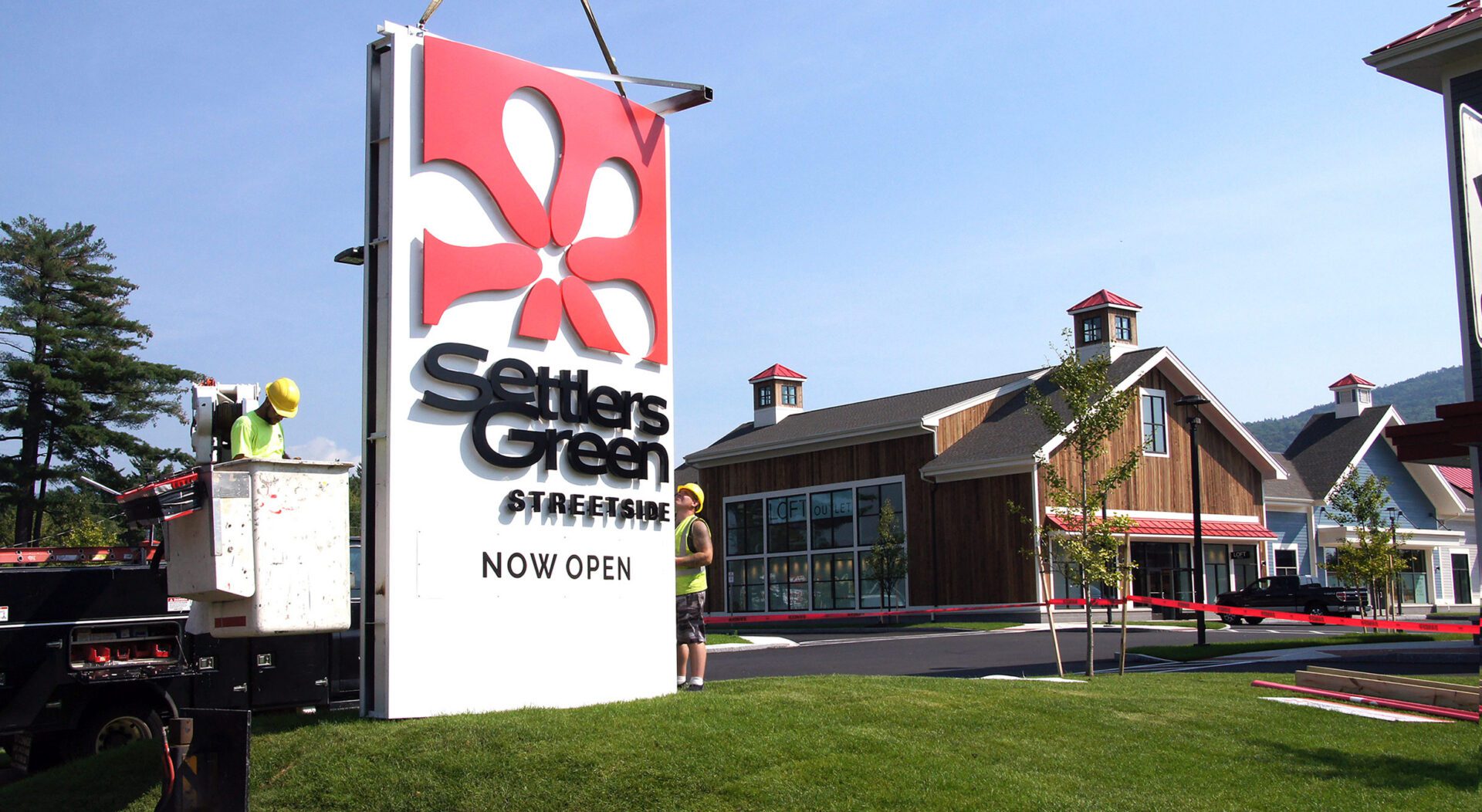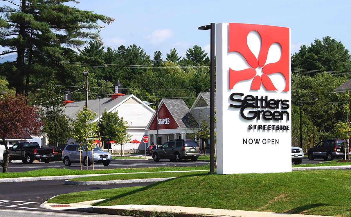 Settlers Green is a large open air retail destination in North Conway, NH that serves both local shoppers and seasonal visitors. Given the scale of the site and the volume of vehicular traffic, visibility from approach and clarity at arrival are critical to how the center functions.