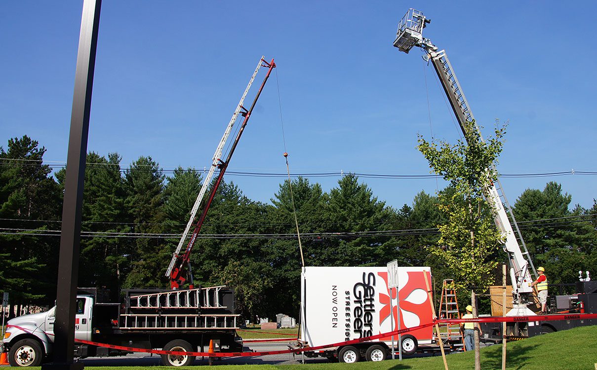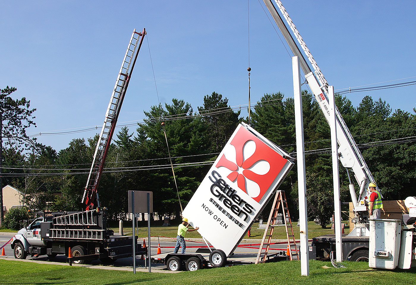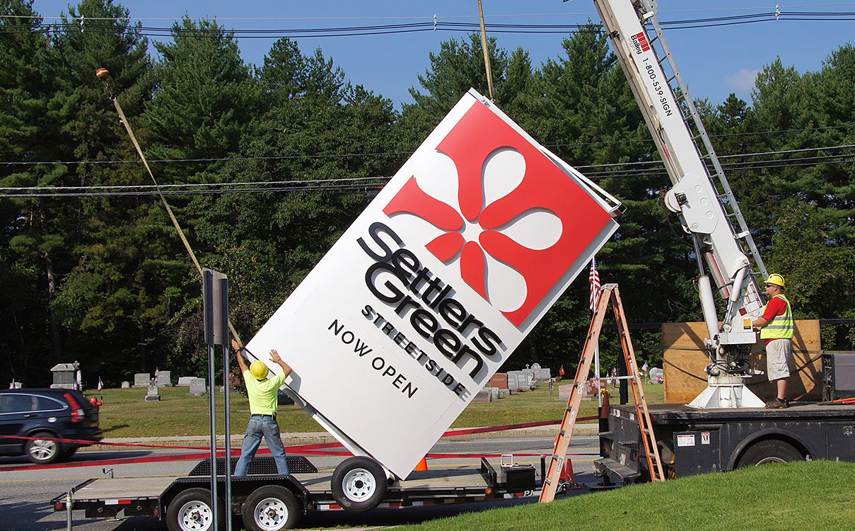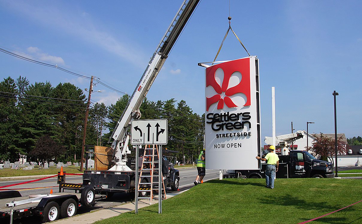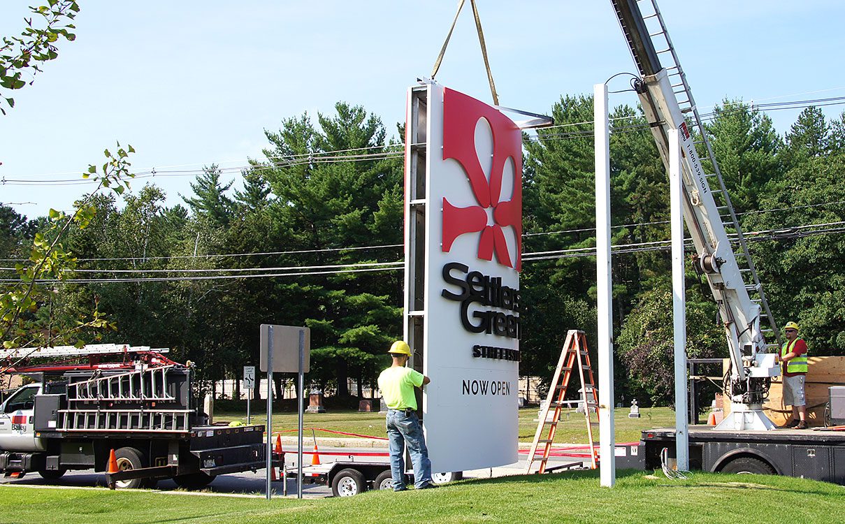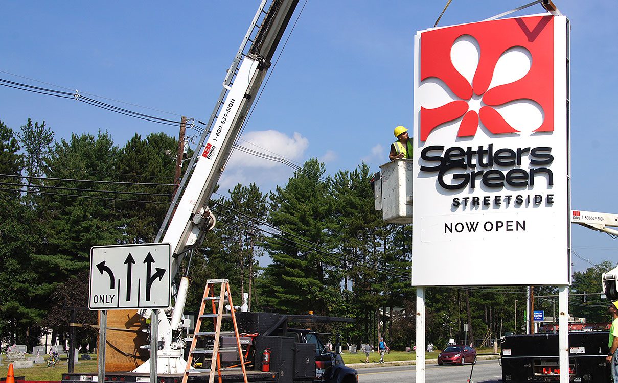 Settlers Green is a large open air retail destination in North Conway, NH that serves both local shoppers and seasonal visitors. Given the scale of the site and the volume of vehicular traffic, visibility from approach and clarity at arrival are critical to how the center functions.