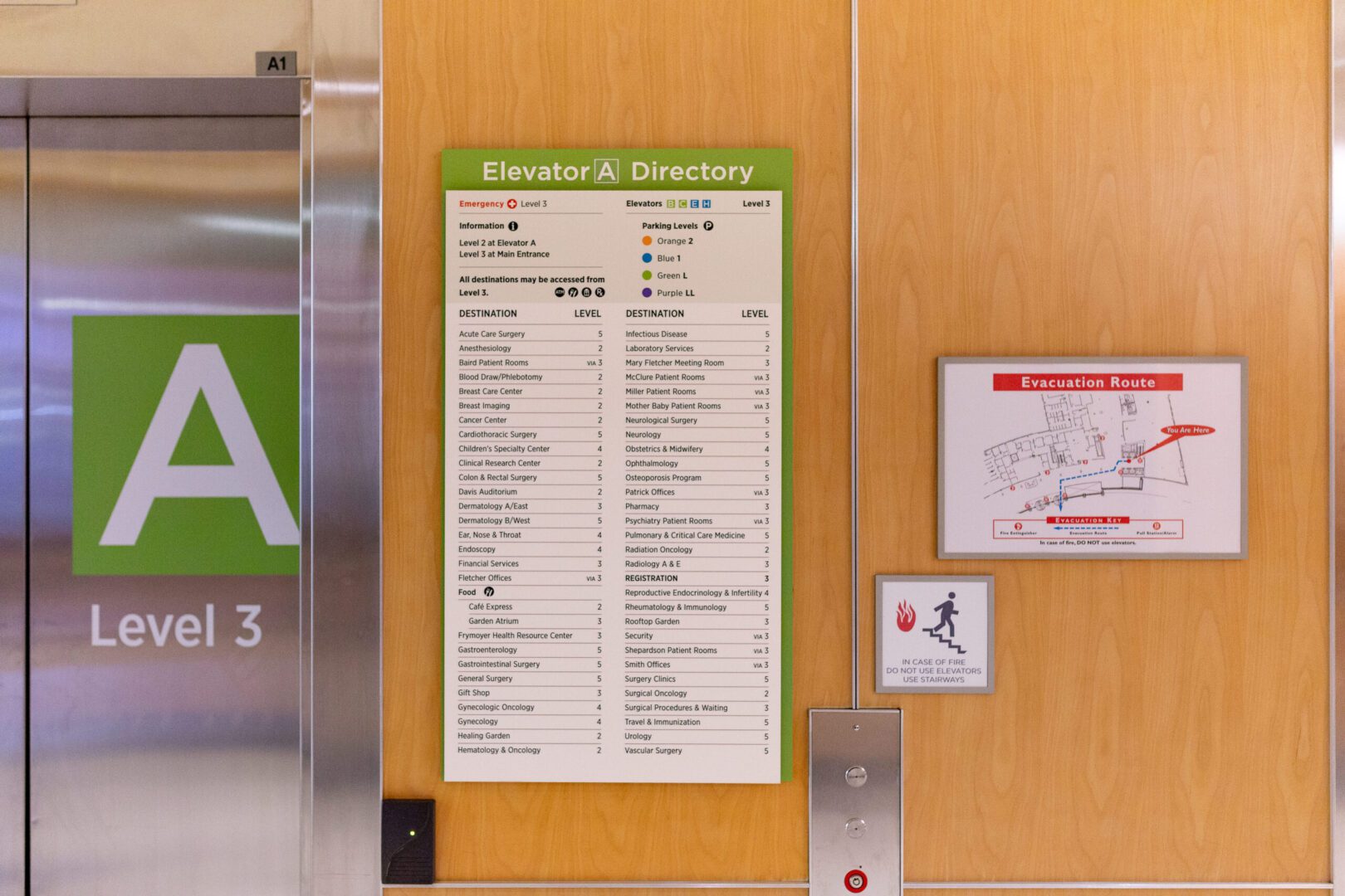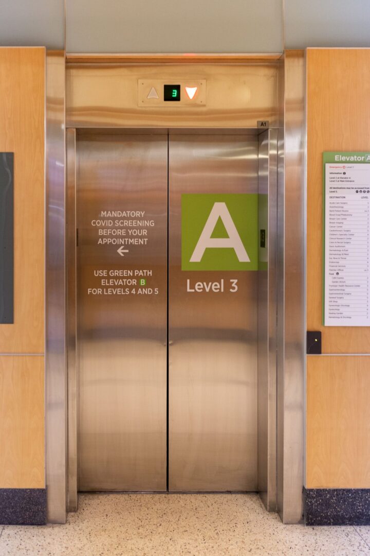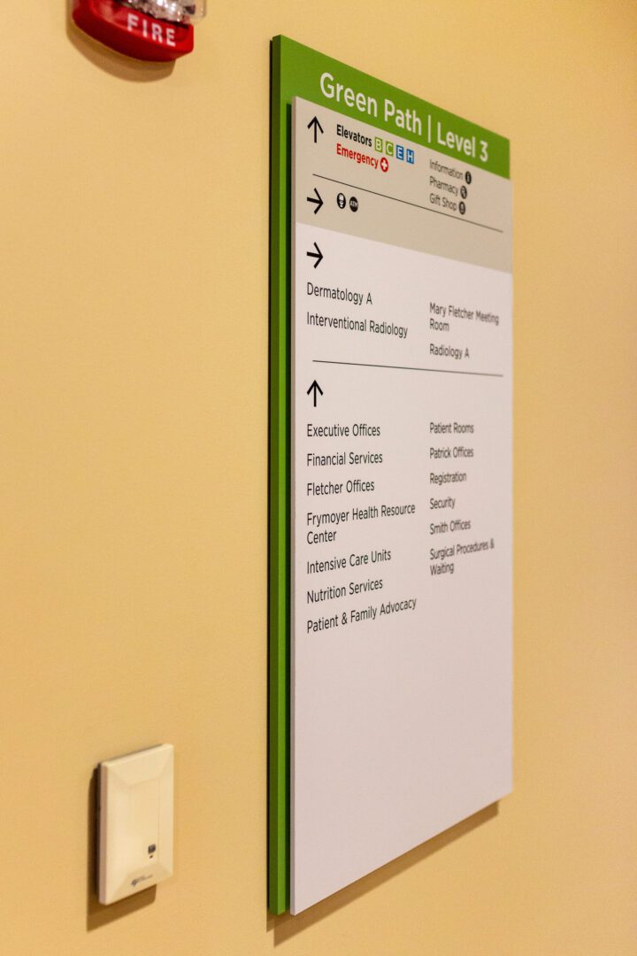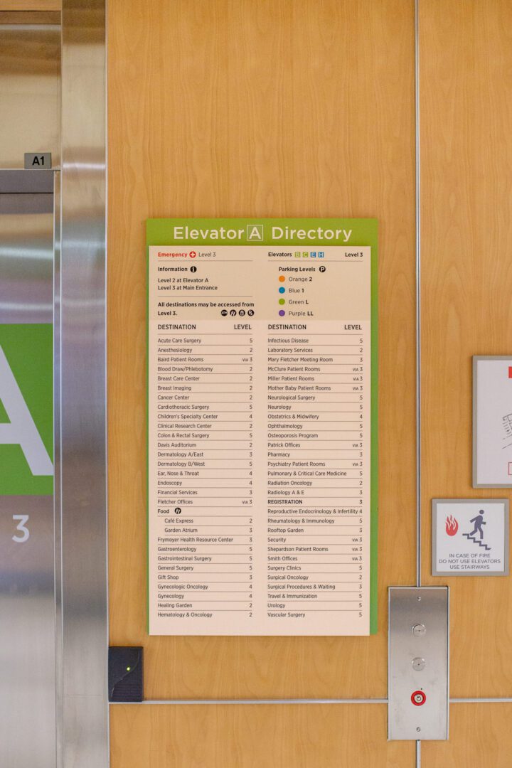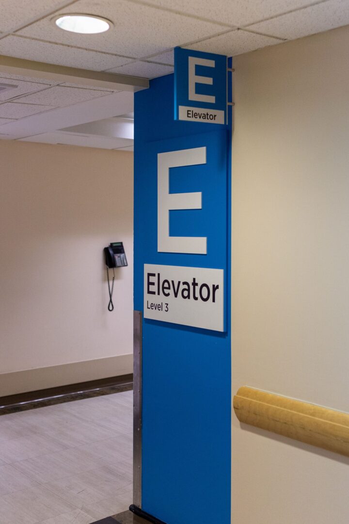 Interior wayfinding and overhead signs were positioned to guide patients, visitors, and staff through long corridors, decision points, and vertical transitions with minimal confusion. Elevator bank signage and directories play a critical role in orienting users within complex cores, clearly communicating destinations while reducing reliance on staff for directions. Dimensional letters were fabricated to reinforce identity and provide clear landmarks throughout the campus.