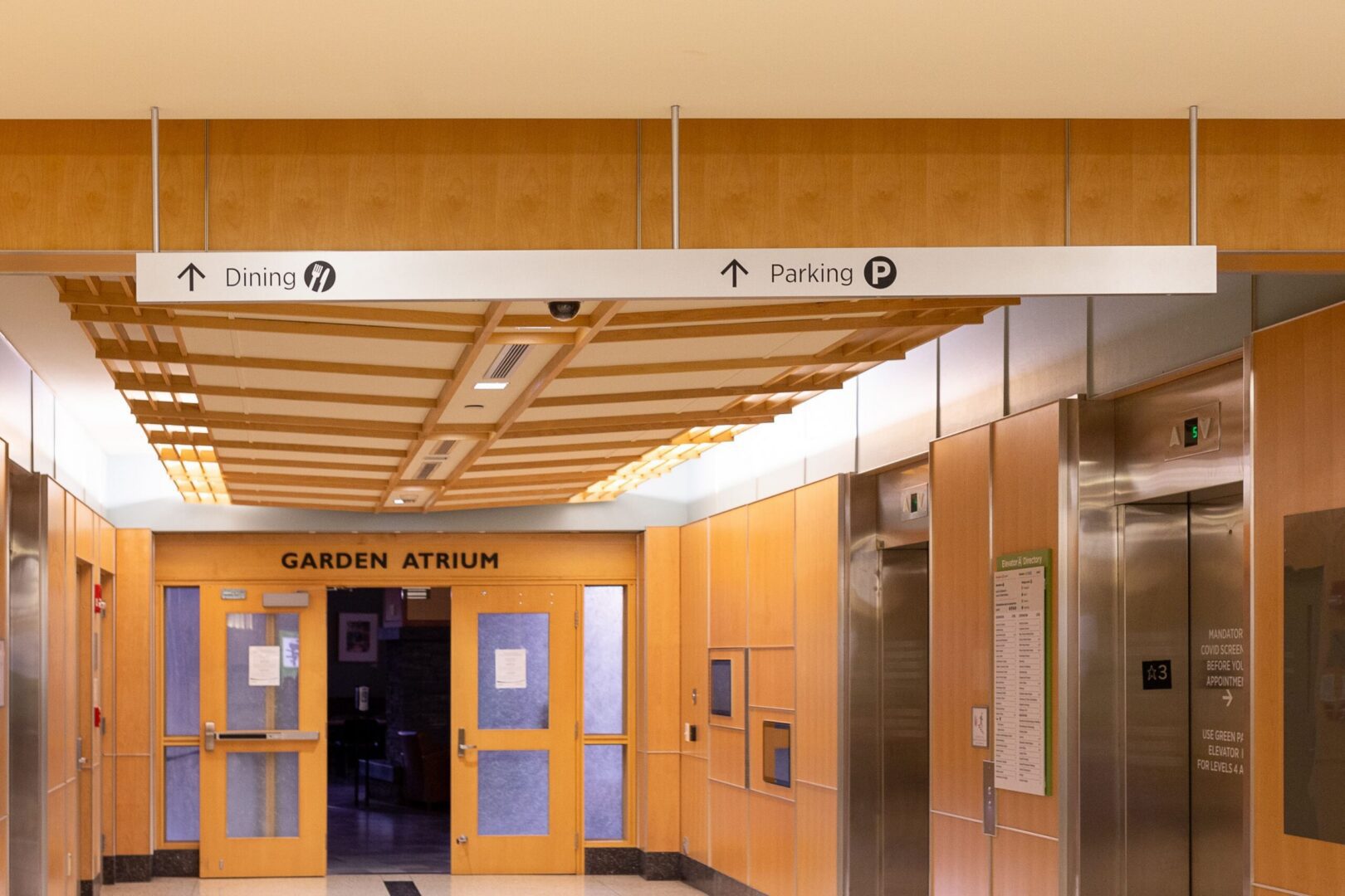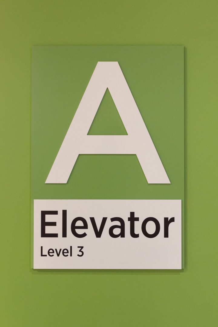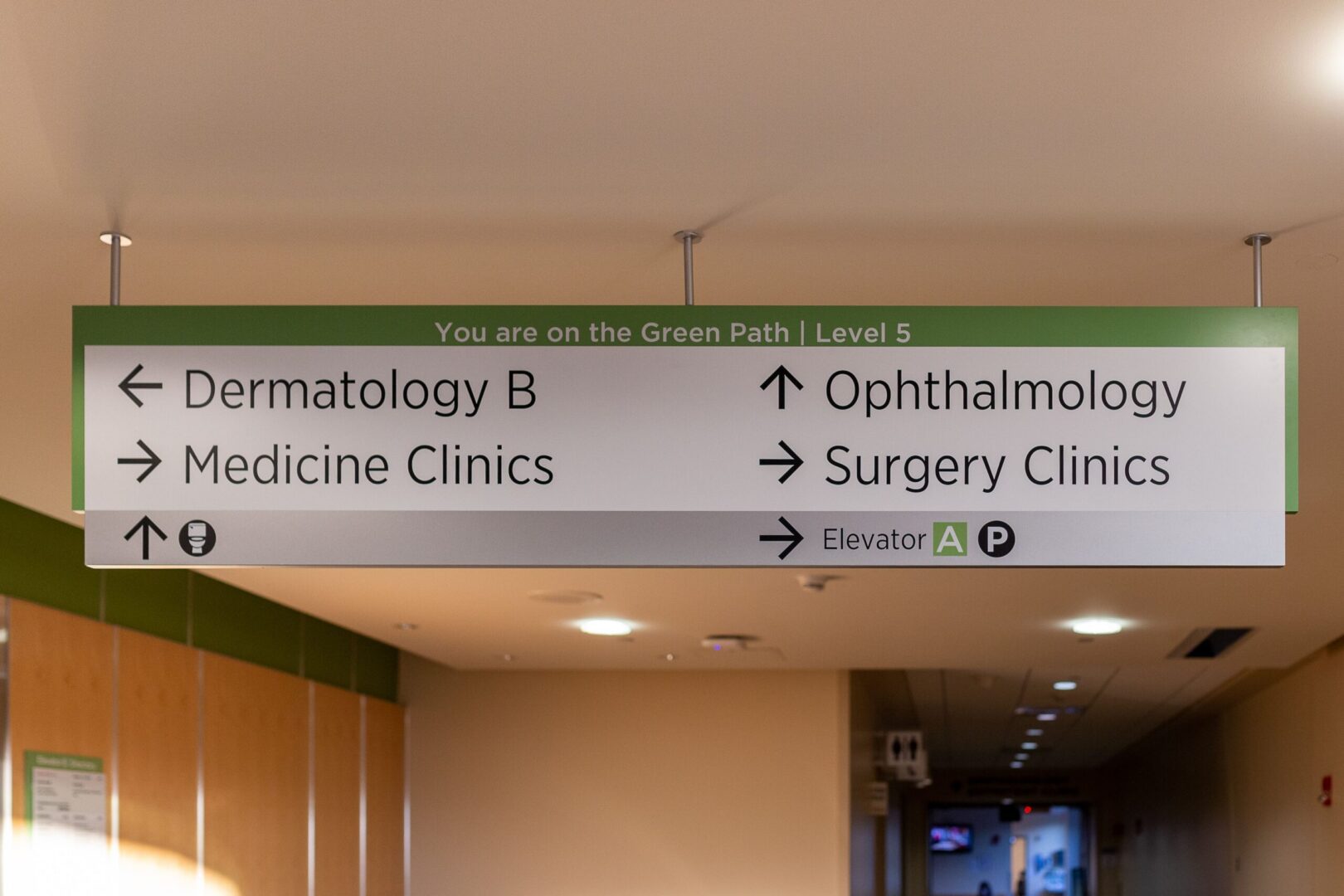Interior wayfinding and overhead signs were positioned to guide patients, visitors, and staff through long corridors, decision points, and vertical transitions with minimal confusion. Elevator bank signage and directories play a critical role in orienting users within complex cores, clearly communicating destinations while reducing reliance on staff for directions. Dimensional letters were fabricated to reinforce identity and provide clear landmarks throughout the campus.